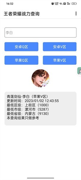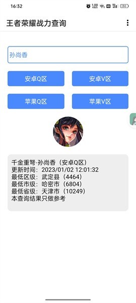 3、软件提供最新的战斗力查询服务,玩家可以通过输入目标英雄的名字直接查询相关信息。而且软件会提供关于英雄最低区域、省份、时间信息的详细数据,让玩家对英雄的表现有更全面的了解。