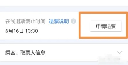 3、在这条订单中拉到最下面会有一个申请退票,你可以看一下退票截止时间。