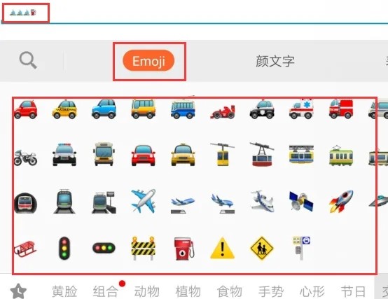 四、接着进入“Emoji表情库”中,逐个点击尝试输入(因为许多无法输入进去,只使用那些能够输入的),输入几个符号的组合,点击输入面板确定按钮。