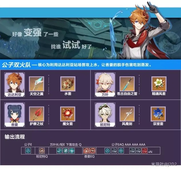 队伍利用达达利亚站场普攻上水,让香菱的脱手伤害吃到蒸发。剩下两个位置一般带辅助角色强化香菱和达达利亚的伤害,推荐搭配万叶和班尼特。因此队伍的主要伤害来源为班尼特万叶加成下的香菱蒸发伤害、达达利亚的大招蒸发伤害和普攻断流伤害。