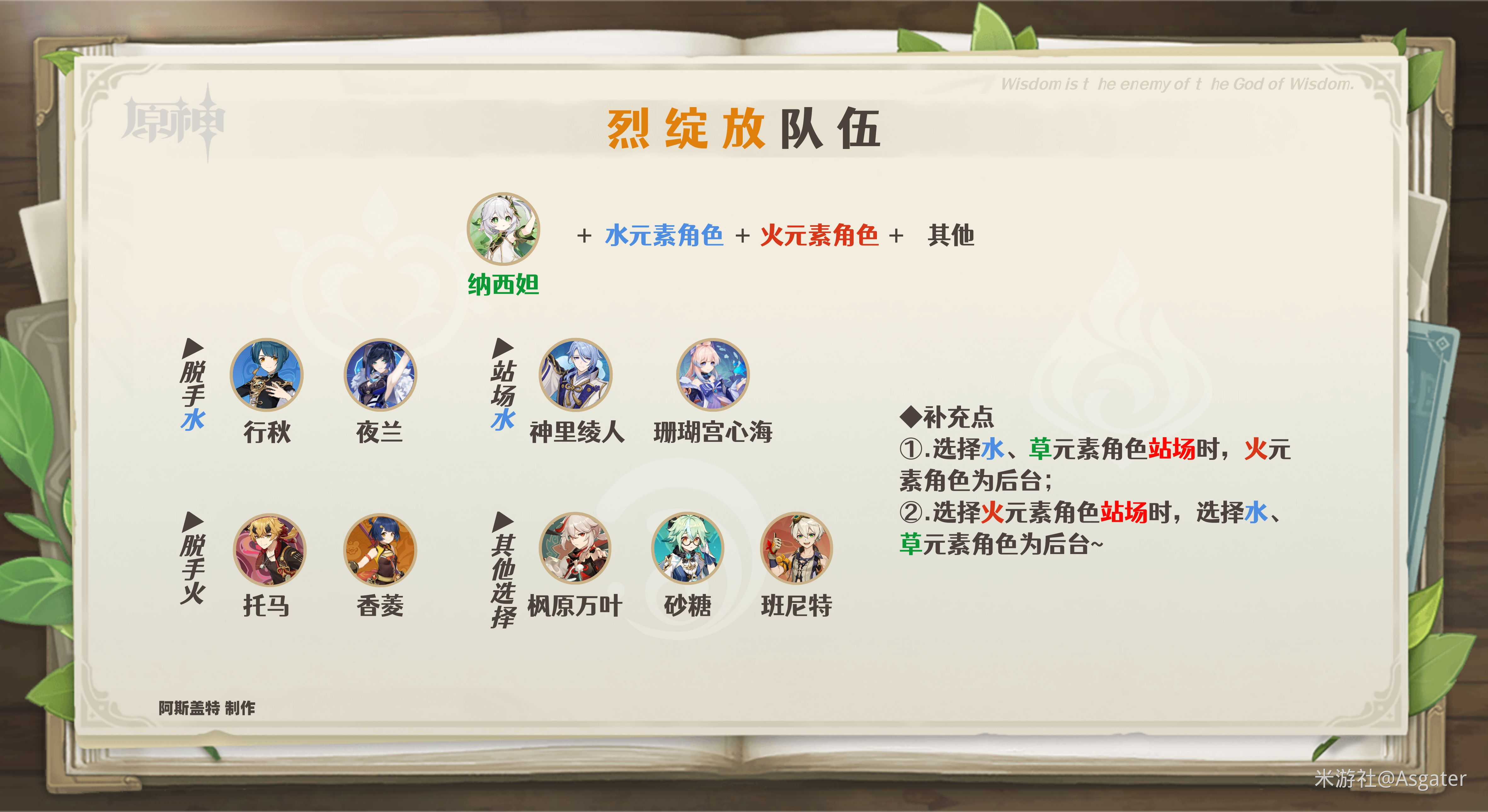 如水元素角**场,那么队伍中的草、火元素角色则更多偏向选择具有后台、脱手技能的角色。