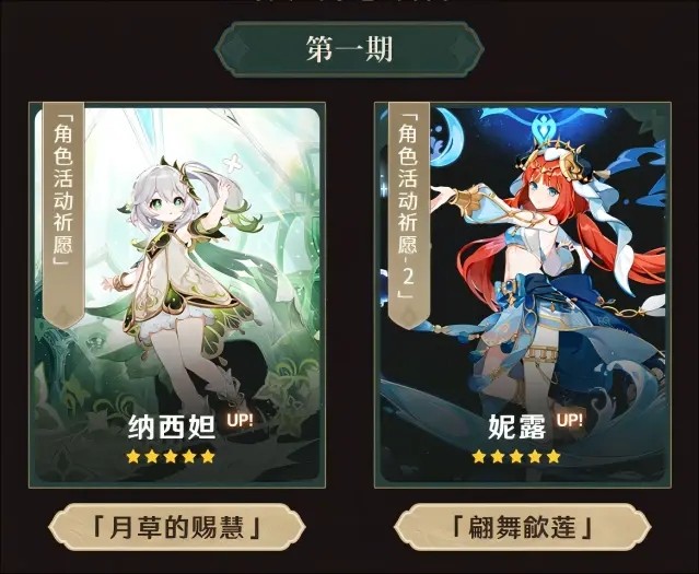 2、角色卡池:上半:纳西妲+妮露。下半:白术+甘雨。