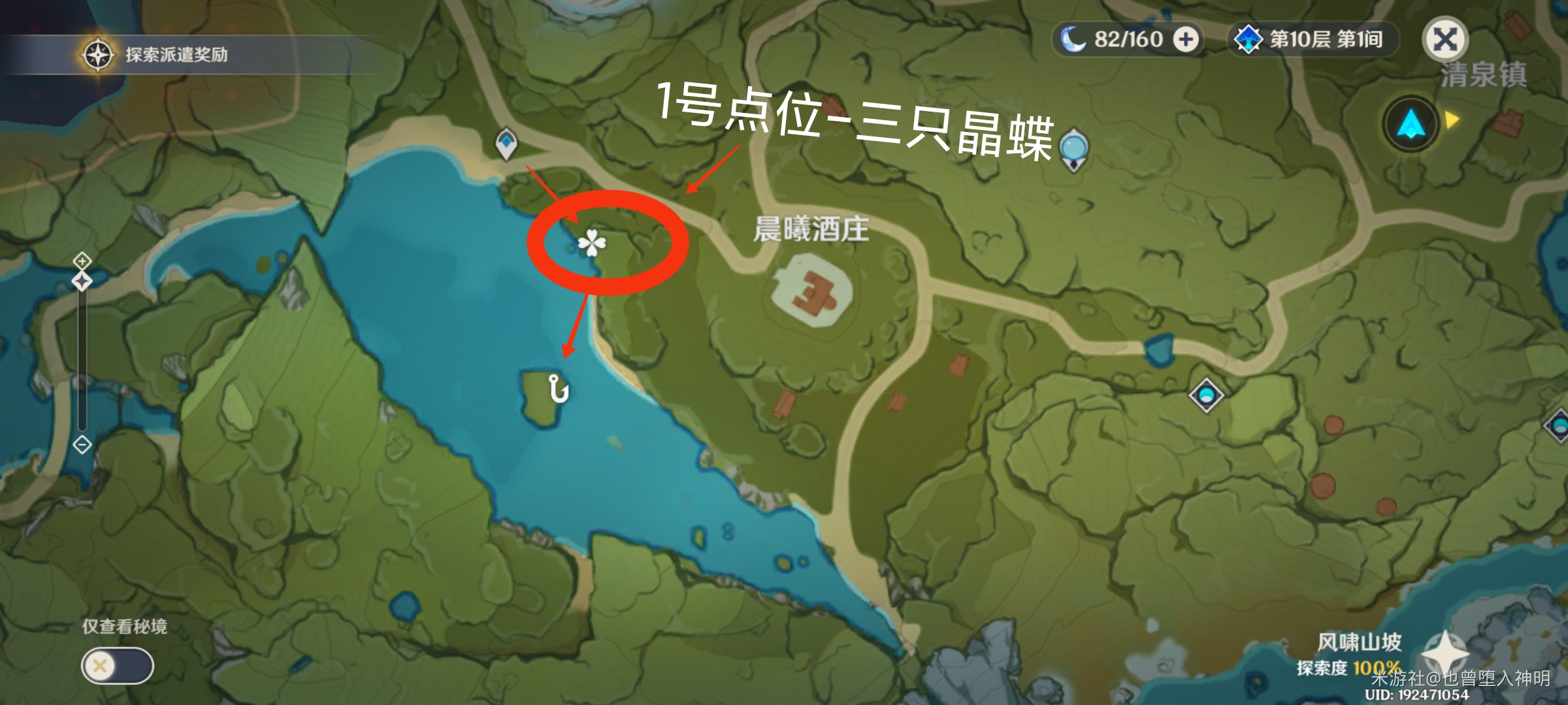 按图中路线前往钓鱼点,一号点位可以顺便抓三只晶蝶
