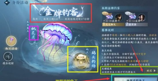 活动时间:每周一,每周三晚上8点,鱼王出现半小时,每次出现五只鱼王,钓完活动结束!