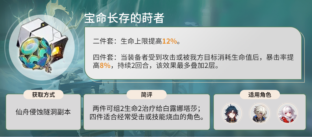 崩坏星穹铁道1.2版本更新了,新增了套装宝命长存的莳者,很多玩家不知道适合给什么角色使用,下面小编为大家带来崩坏星穹铁道宝命长存的莳者推荐,感兴趣的小伙伴一起了解一下吧。