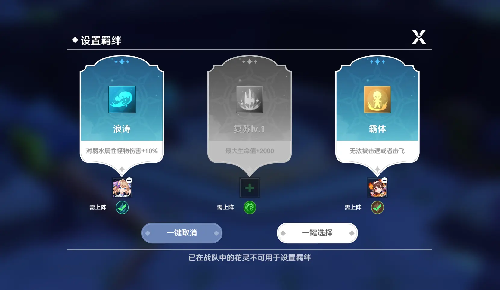 2、进入闯关后,冒险者可根据关卡要求设置羁绊花灵,每上阵1个指定属性的花灵,就能激活1个羁绊增益。羁绊花灵不需要养成度,只需要属性契合,大幅提升仓库管理员再就业率!