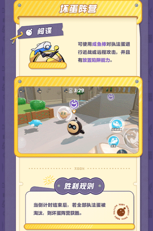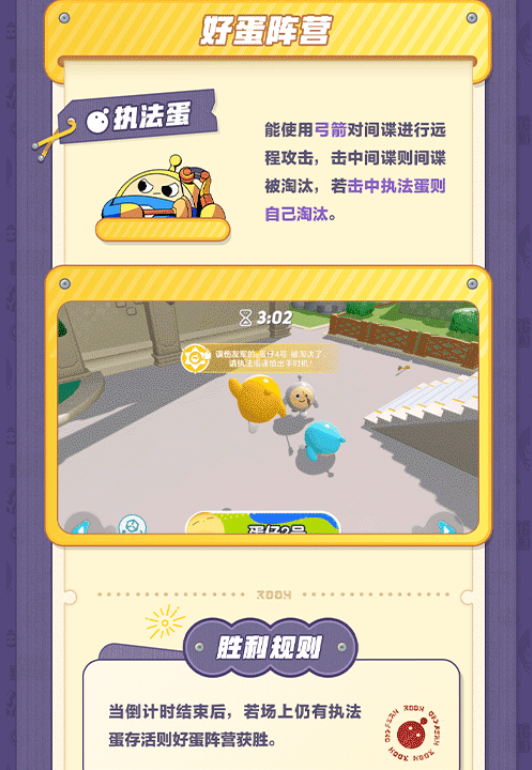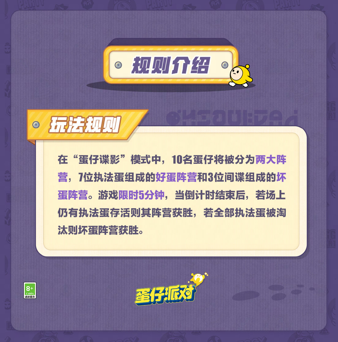 10名蛋仔将被分为7名执法蛋组成的好蛋阵营与3名间谍组成的坏蛋阵营,双方身份皆笼罩在未知的谜团之下,迎面走来的究竟是队友还是敌蛋?