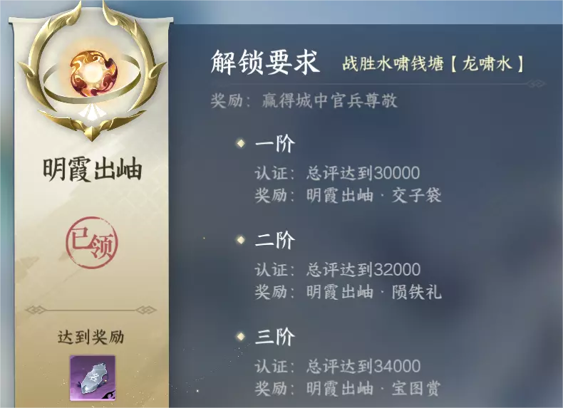 2.成名赏达到明霞出岫即可,完成条件在下图