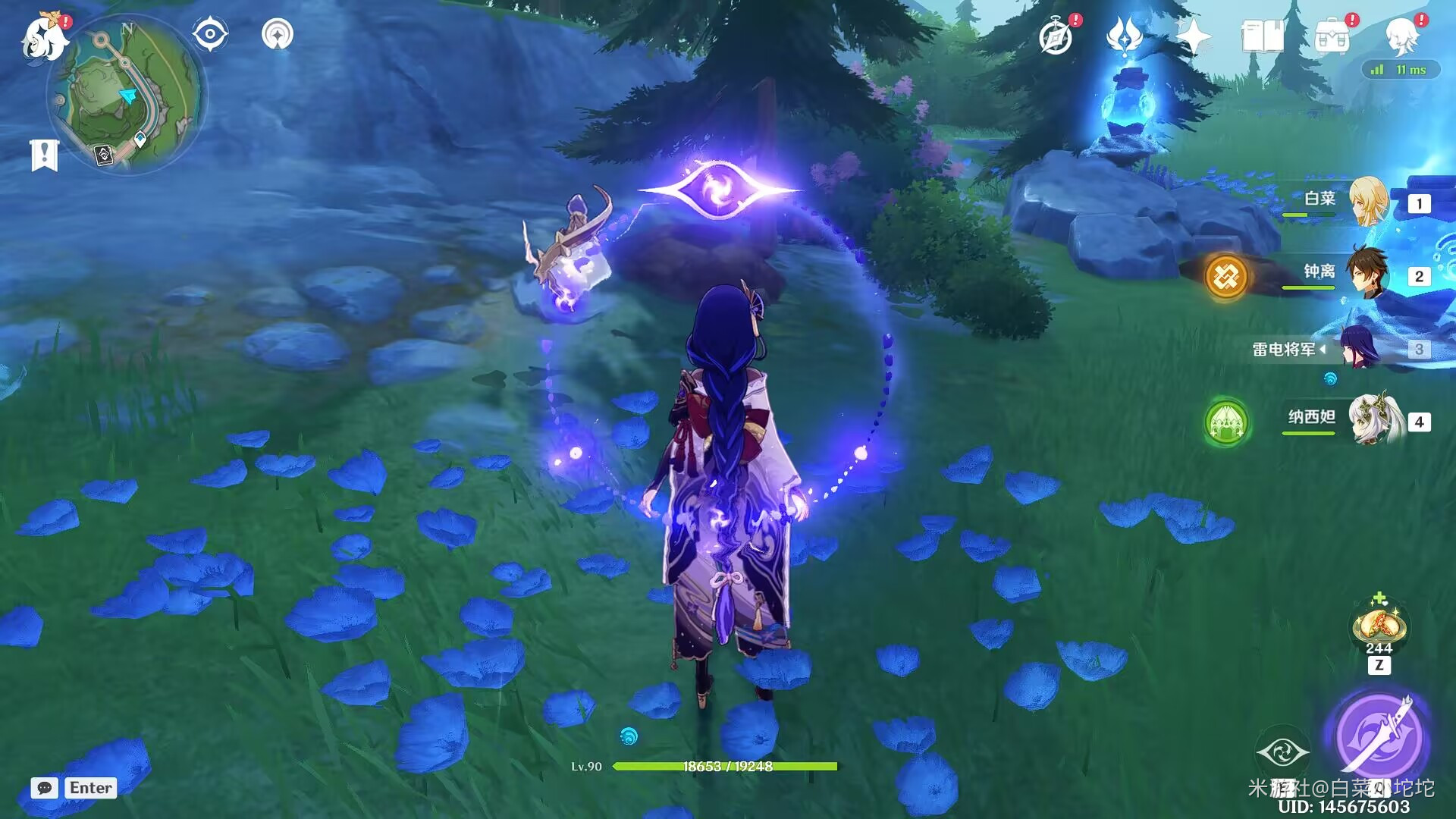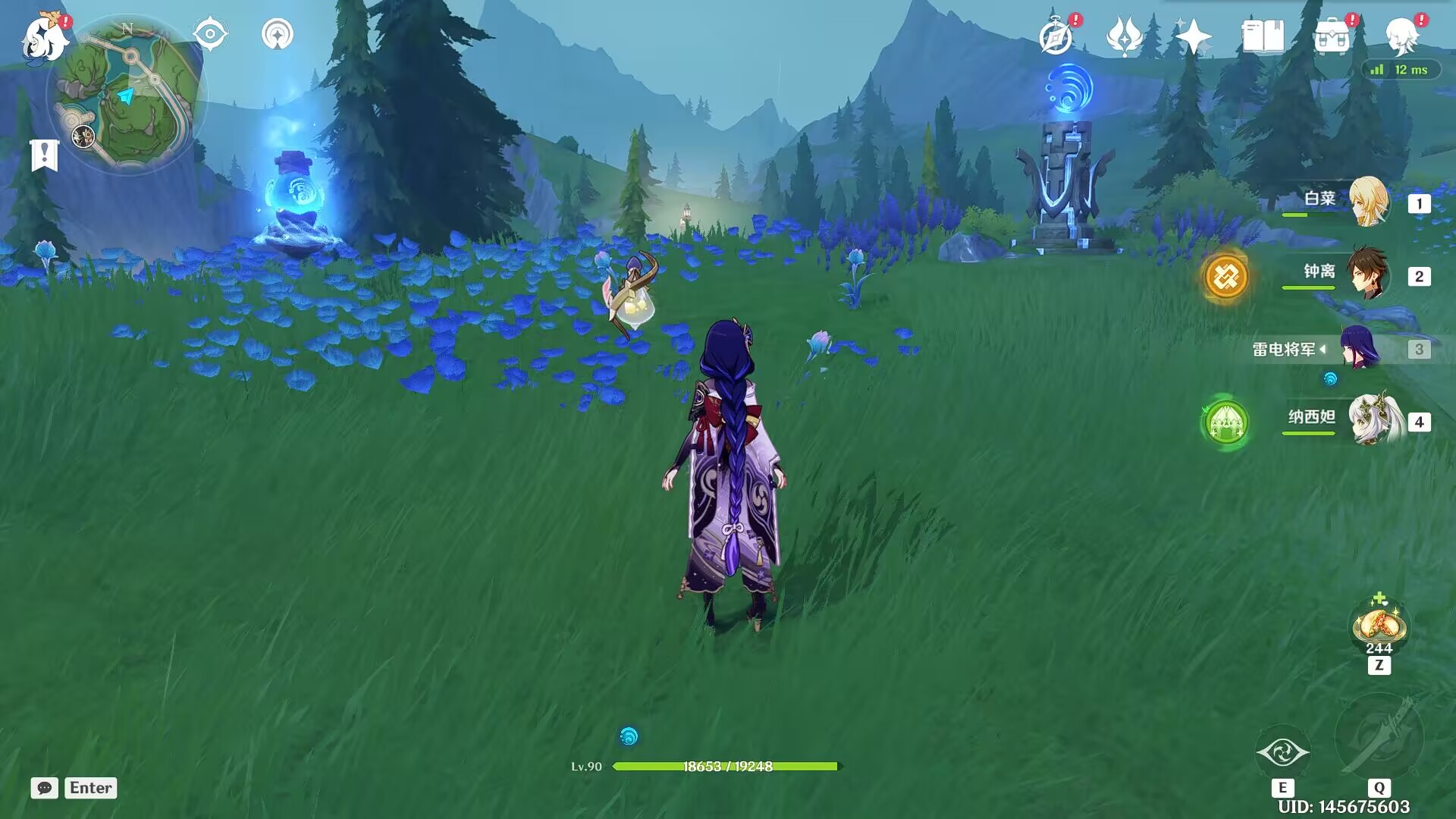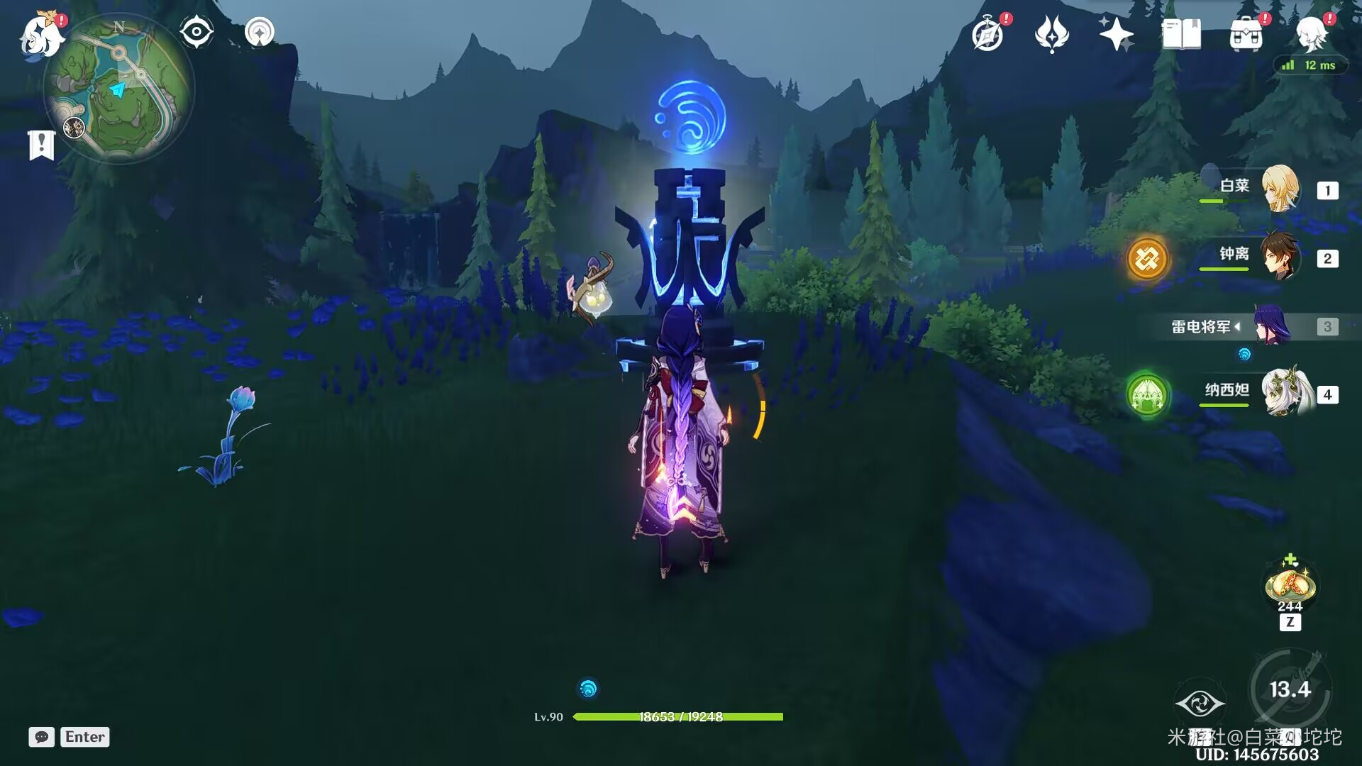 哦,对了。再往坡下走也有一个封印的宝箱,走进会出现两个水元素丘丘萨满和两个水史莱姆,直接走到宝箱那里,让丘丘萨满的下雨法阵覆盖三个水量侦测晶体就可以开启宝箱啦。