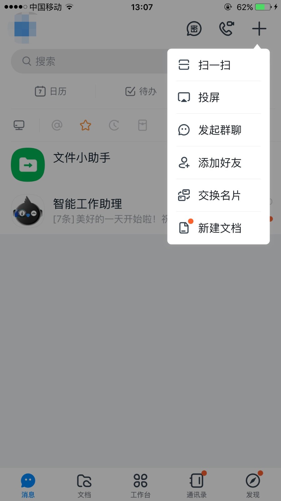 2、打开钉钉,点击右上角的加号,找到“投屏”按钮