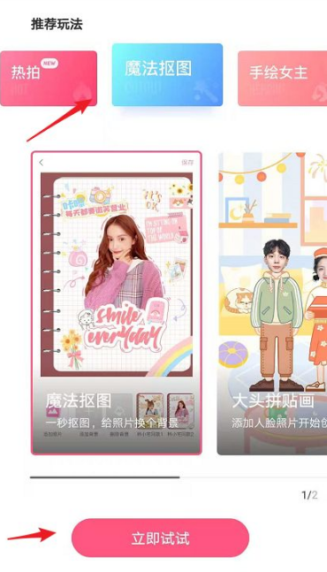 如下图所示,找到一甜相机中的魔法抠图功能,然后点击下面的立即试试按钮。