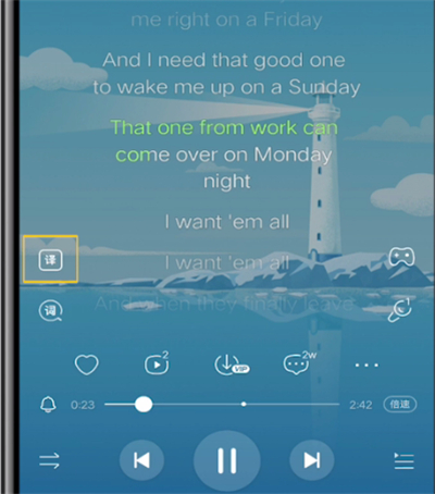 2.点击正在播放的英文歌曲头像进入歌词界面,然后点击左边的译图标即可